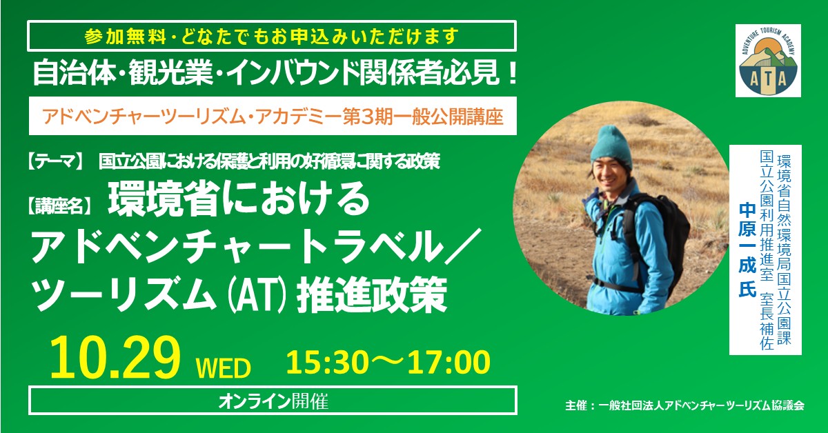 一般社団法人日本アドベンチャーツーリズム協議会(本社:東京都品川区、代表取締役:大西 雅之)は、アドベンチャーツーリズム・アカデミー一般公開講座を10月29日(水)に開催します。